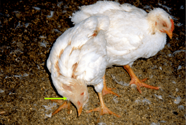 1. Искривленная шея у кур и цыплят бройлеров. Шея курицы скручивается в одну сторону, из-за чего птице становится трудно есть и пить.