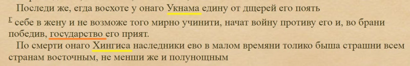 7. Говоря о татарах перед нашествием, Лызлов указывает что они пережили междоусобицу. Точно как и славяне в европейской Руси. И объединил татар царь Хингис. Он же Цынгис по европейским источникам. Сейчас нам его имя известно как Чингиз хан. При этом Хингис сперва объединил часть мелких регионов в Поволжье. А когда дошла очередь до объединения с главным противником, ради объединения предложил ему породниться кровью, взяв себе в жёны одну из дочерей государя противоположной стороны по имени Укнам. Но получил отказ, от чего пошел войной и победил. В приведенной цитате Лызлов употребляет слово "государство". А я писал выше, что это слово Лызлов употребляет крайне редко. То есть Лызлов здесь делает акцент на том, что татары это не сброд кочевых племён под управлением пастуха в палатке, а народ имеющий собственное государство. И называлось оно Великая Тартария. О чем я писал в прошлой статье.