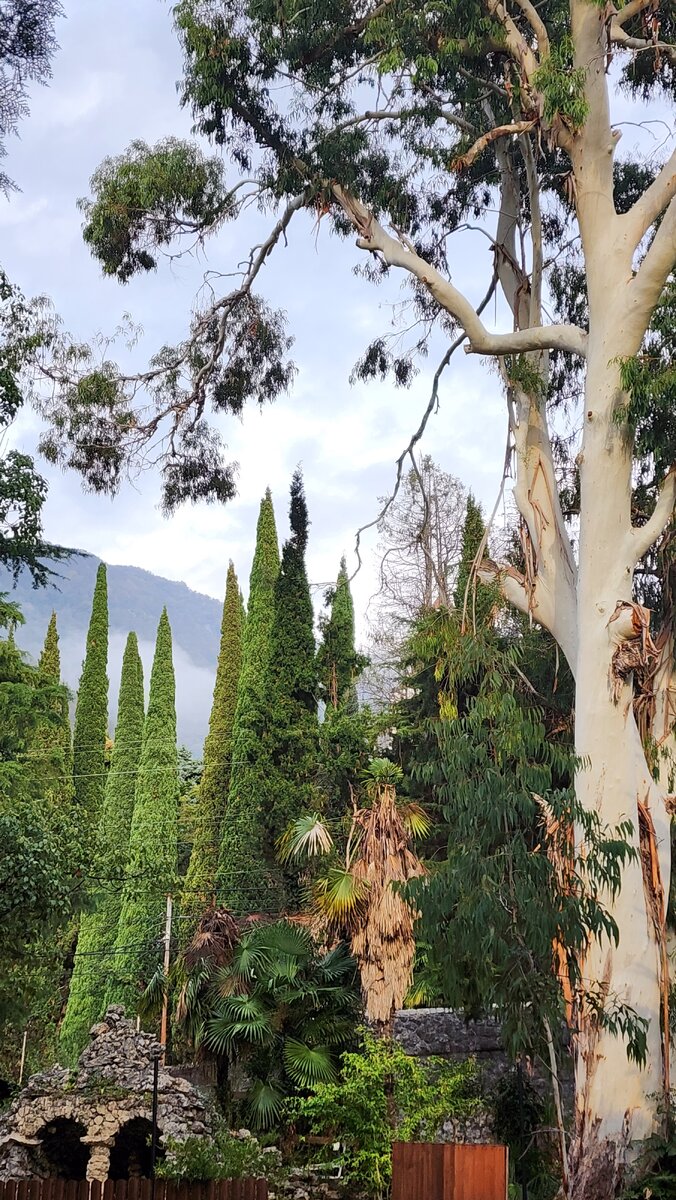 Отобедав, и распрощавшись с назойливым ухажёром, я снова вышла на эвкалиптовую аллею и отправилась гулять. Кто на канале в первый раз, меня зовут Яна, мне 54 и я рискнула уехать из Сибири в Крым в разгар пандемии, летом 2020-го. С 15 мая 2023-го живу без привязки к месту. Прямо сейчас еду в Москву. Все посты о жизни бомжующего путешественника читайте в подборке: План был дойти до дворца принца Ольденбургского, а затем из Аабаты как-то добраться до Псоу. Чем дальше идёшь в сторону Старой Гагры, тем красивее становится всё вокруг. Все-таки в Абхазии природа имеет первозданную силу и действует очень мощно. И даже разруху она вписывает в пейзаж и делает элементом природного стиля. Я слишком чувствительна к живой настоящей природе, поэтому пока шла эти 5 километров, наполнилась так, что впечатлений было уже просто под завязочку. Пальмы вдоль моря и усыпанные финиками дорожки под ними. Кипарисы свечками в небо, чередующиеся с бело-зелёными флагами. Цветущие неизвестные мне фиолетовые