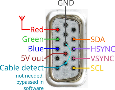 Что мы тут видим? 1, 2, 3 пины - это сигналы R, G, B, которые отвечают за цвет изображения. 4, 11, 12, 15 -это бывшие ID монитора и они нас не иннтересуют вообще (а современные SDA и SDL в частности). А вот 13 и 14 - это горизонтальная (строчная) и вертикальная (кадровая) синхронизация соответственно. Ну а остальное - земля (кроме 9 пина - там может быть +5 вольт).