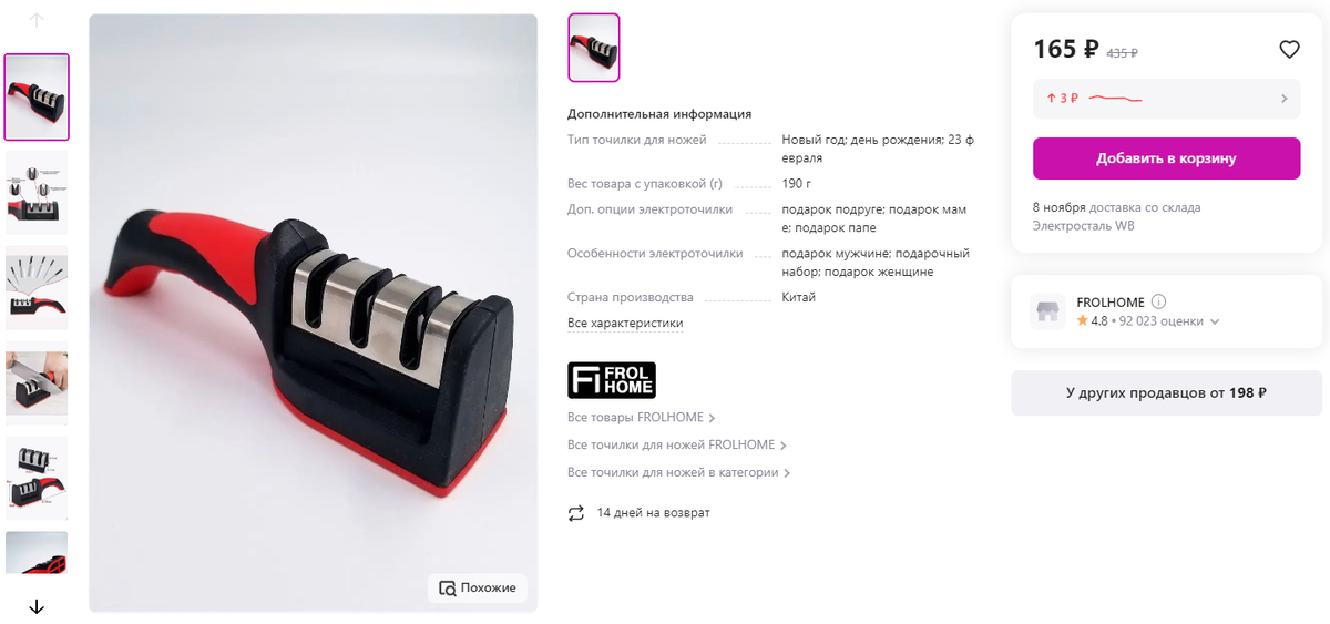 Сначала подпишитесь на канал, чтобы не потерять его Ножеточка - отличный помощник на кухне, как для женщин, так и мужчин. Тем более на распродаже Вы можете купить ее по очень выгодной цене Магнитный держатель для автомобиля. Как заверяет продавец. Вес, который он выдерживает - до 1 кг. Цена существенно ниже, чем у других продавцов. Ведь мы публикуем самые выгодные предложения. Переходите по ссылке выше, чтобы узнать подробности. Быстрая зарядка. Можно использовать для type-c и lighting. Зарядка за 30 минут - 50% Высокая мощность и множество положительных отзывов. Сделайте свой заказ сейчас пока действуют большие скидки на Wildberries. Распродажа 11.11, вайлдберис, валберис