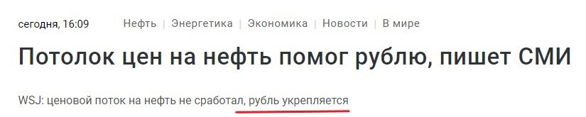 Обнаружил небольшую заметку с заголовком, гласящим, что потолок цен на нефть не сработал и помог рублю укрепляться. И ссылается она прямо на статью в Wall Street Journal! Саму статью, к которой идет отсылка, я прочитать не могу, поскольку она требует платной подписки: Поэтому не знаю, все эти суждения действительно взяты из WSJ, или выдуманы, но я вижу просто совершенно неверные утверждения, поэтому не смог пройти мимо. Все, с чем можно согласиться - это то, что потолок цен на нефть сейчас действительно все больше показывает свою неэффективность - с этого, собственно, и начинается статья. Я тоже писал на эту тему, и объяснял, почему: Но вот дальше... цитирую целый абзац, который, собственно, и является ключевым содержанием статьи. В статье отмечается, что доходы от нефти и газа в российский бюджет в октябре выросли более чем в два раза по сравнению с месяцем ранее. Потолок цен перестал был эффективной мерой воздействия на доходы России, так как по мере роста экспорта России снижается д