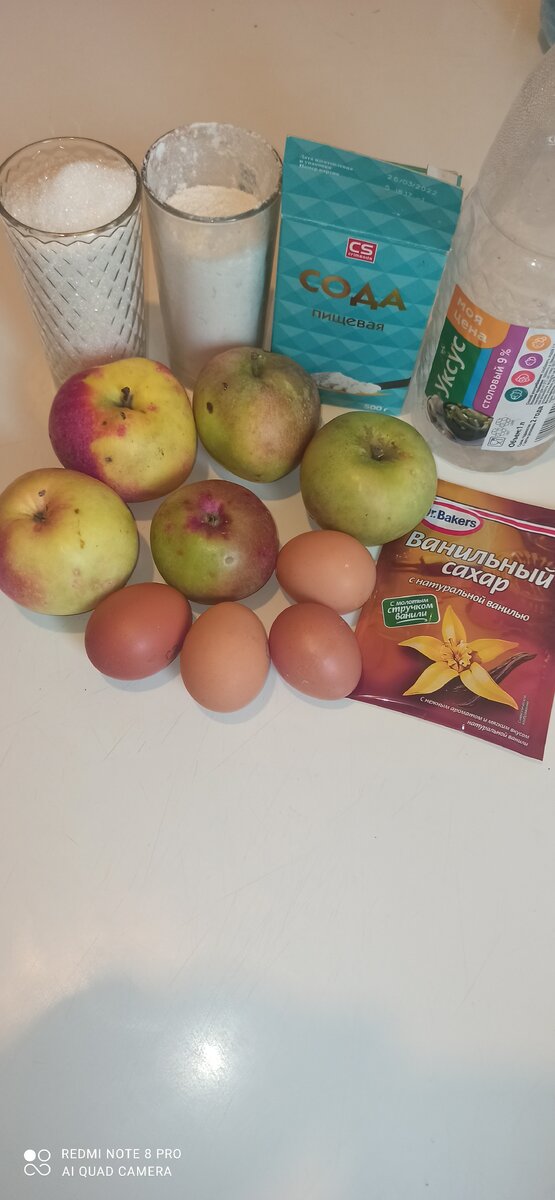 Для приготовления понадобиться: Яблоки-5 шт Сахар-1 стакан Мука-1 стакан Яйца-4 шт Сода-0,5ч.л. Уксус-1/4ч.л. Ванильный сахар-15 г. 1. Яблоки нарезать так, как вам удобно. 2. В отдельную чашку разбить 4 яйца 3. К яйцам добавить стакан сахара 4. К яйцам и сахару добавить муку, ванильный сахар. 5. 0,5ч.л. соды погасить 1/4ч.л. уксуса и добавить в смерть. 6. Всё хорошо перемешать. 7. К тесту высыпать яблоки. Не пугайтесь, что самого теста получается меньше, чем яблок. 8. Форму для выпекания(у меня диаметром 28см) застелить пергаментной бумагой и смазать по солнечным маслом. 9. Тесто с яблоками выложить в форму и разровнять. 10. Форму с пирогом поставить в духовку. Выпекать при температуре 200 градусов 40 минут периодически протыкая шпашкой,проверяя на готовность. 11. Через 40 минут достать пирог и дать ему остыть. После остывания снять форму и выложить на блюдо. Пирог готов! Приятного аппетита!