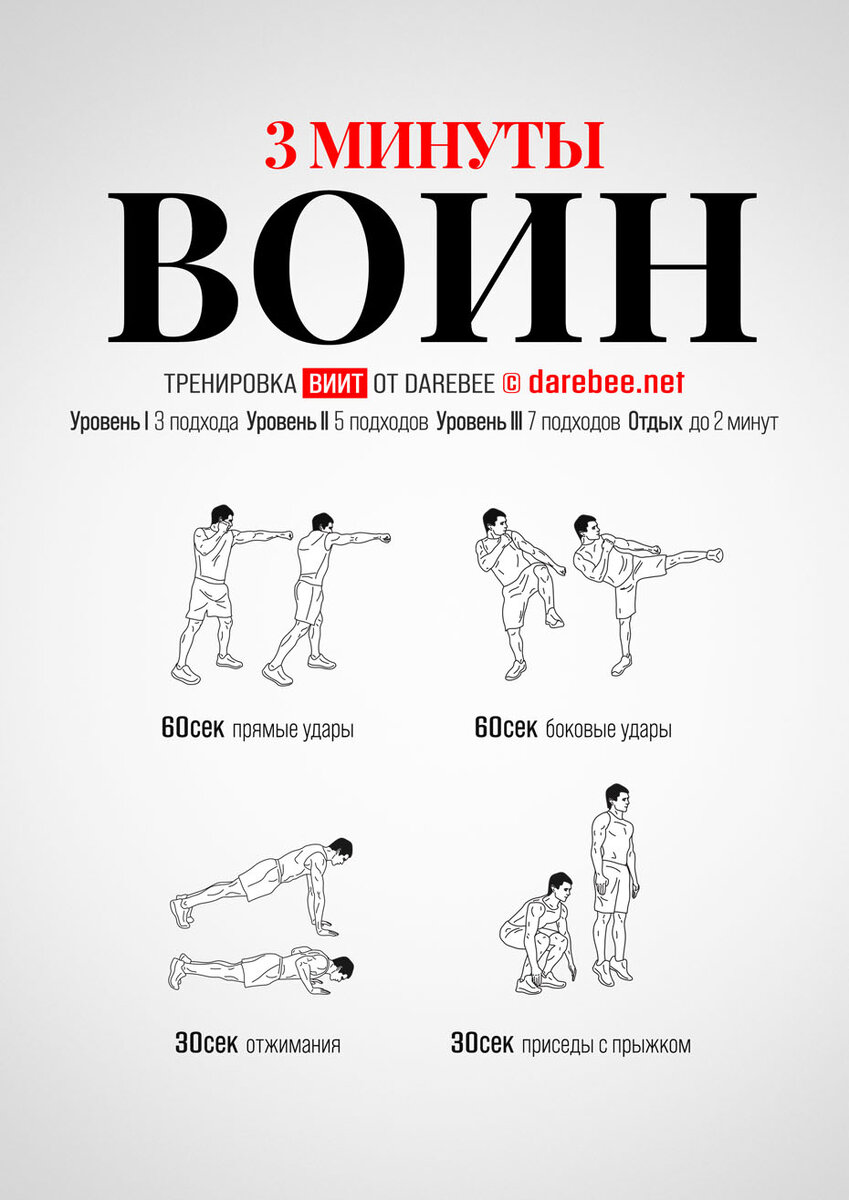 Новый релиз — Воин 3-минутная тренировка Воин - это тренировка с боевыми движениями Darebee, которая заставит вас преодолеть границу ваших возможностей. https://darebee.net/3minute-warrior-workout.html ЦЕЛЬ: все тело ТИП: боевые искусства СЛОЖНОСТЬ: 4 — НЕ подходит для начинающих