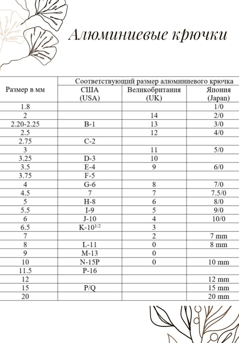 Выбирая крючок, можно столкнуться с разными системами их нумерации. Чтобы не держать в голове все цифры, и легко определить, какого метрического размера крючок, предлагаю Вам удобные таблицы, в которых есть вся основная информация. Сохраняйте, и не теряйте времени на поиски. Если Ваш крючок произведён в России или Европе (исключение Англия), то его размер будет совпадать с его номером (например, 2мм=№2), для всех остальных случаев сверяйте страну производителя и номер крючка по таблицам.