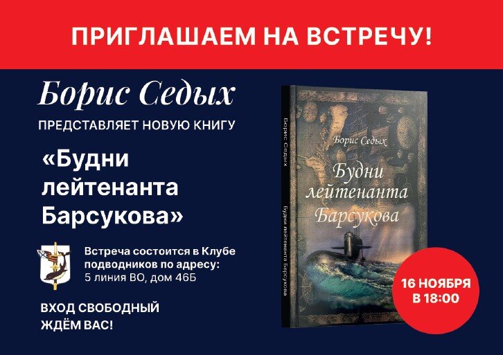 Приходите все, кому интересно, 16 ноября к 18-00 в Клуб моряков-подводников! Адрес прежний: 5 Линия В. О. д. 46Б (вход со двора, не промахнётесь).