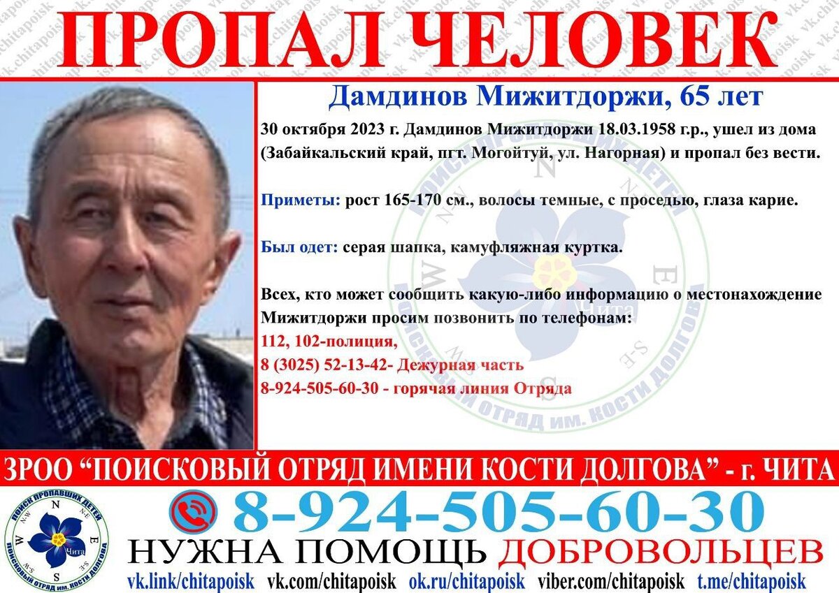 Пожилой мужчина 30 октября ушел из дома на улице Нагорная в посёлке Могойтуй и пропал без вести. Об этом 5 ноября сообщалось в Telegram-канале поискового отряда имени Кости Долгова. Рост пропавшего составляет 165-170 сантиметров, волосы темные, с проседью, глаза карие. Он был одет в серую шапку и камуфляжную куртку. Всех, кто обладает какой-либо информацией о местонахождение мужчины, просят позвонить по телефонам: 112, 102 - полиция, 8 (3025) 52-13-42 - дежурная часть, 8-924-505-60-30 - горячая линия Отряда.