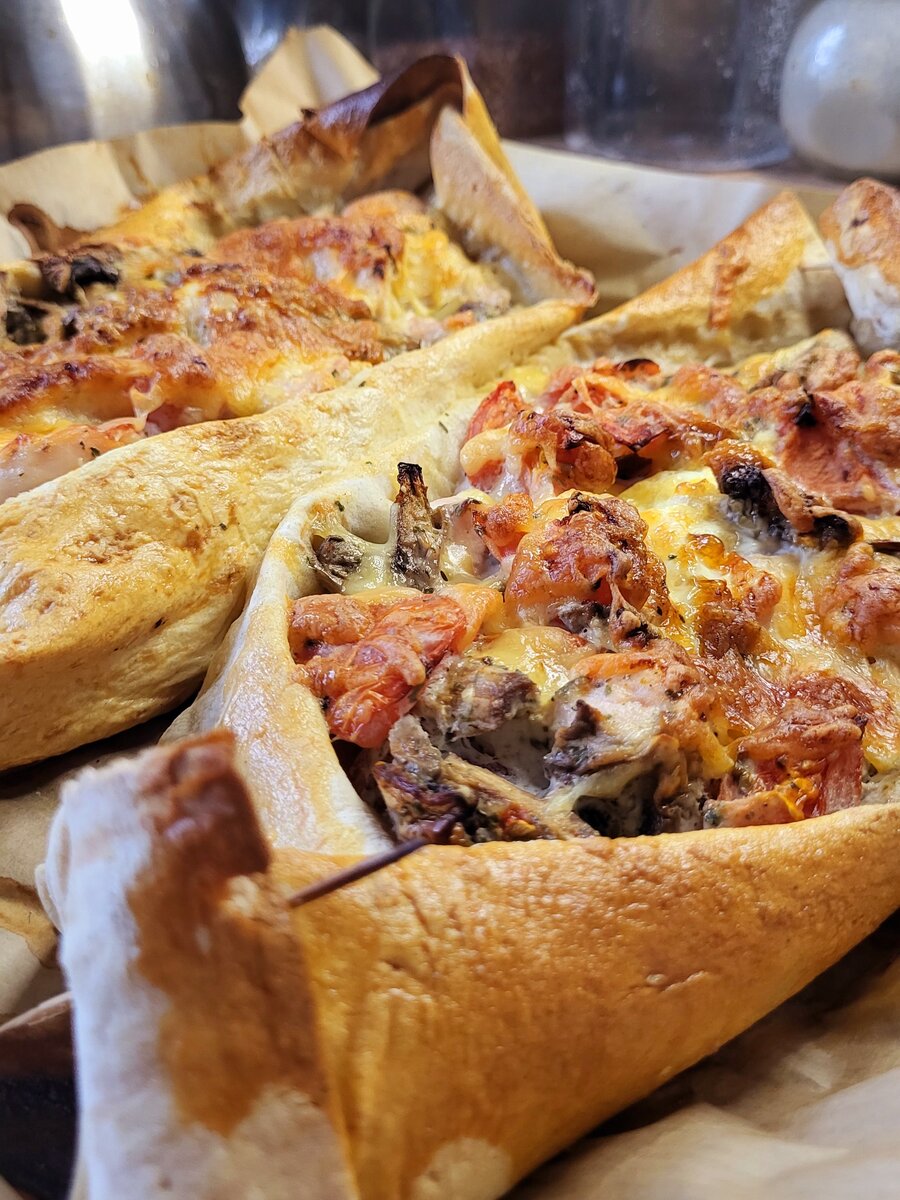 Решила приготовить, что нибудь вкусное на ужин и особо при этом заморачиваться не охота. Поэтому готовим из того что есть в холодильнике 😁 И нам понадобится ✅️ 300 грудки ✅️ 300 гр. Шампиньонов ✅️ 2 помидора ✅️ 3 ст.л. сметаны ✅️ 100 гр. Сыра ✅️ 2 листа тонкого лаваша ✅️ соль, перец и любимые специи Грудку наризаем крупным кубиком. И складываем в глубокую тару. Ещё нам потребуется грибы. У меня залежавшиеся шампиньоны😅 Наризаем их тоже крупно. Ещё нам потребуется помидоры Наризаем кубиком Складываем все нарезанные ингредиенты в глубокую тару. Добавляем соль, перец и любимые специи Туда же добавляем сметану. И хорошо перемешиваем Начинка готова, теперь берём тонкий лаваш. И формируем лодочки скрепляя по бокам зубочистками. Как показано на фото ниже👇👇👇 Внутрь каждой лодочки выкладываем начинку. Сверху посыпаем сыром, лаваш смазываем яйцом и отправляем в духовку при 180 градусах на 40 минут. И 40 минут спустя ужин готов Это очень вкусно и готовится просто. Всем желаю пр