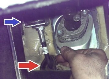 Снятие: 1) Сперва выньте резиновый пальник, который закрывает отверстия в которое трос сцепления выходит, чтобы в него грязь не попадала и влага (Данный пыльник указан красной стрелкой), как только он будет вынут, при помощи гаечного ключа «на 8» выверните гайку (Ищите в том месте которое синей стрелкой указано, гайку на фотографии правда видно плохо), благодаря которой упор оболочки троса крепится к кронштейну и как только гайка будет вывернута, снимите упор с кронштейна. 2) Теперь посмотрите в то место, куда кончик троса сцепления подсоединяется (А подсоединяется он к концу педали, более подробней смотрите на фото ниже), данный кончик установлен на палец педали сцепления (Палец указан синей стрелкой) и закреплён на нём при помощи фиксатора, который указан красной стрелкой, как вы можете видеть, на фото этот фиксатор уже снят, у вас же он на пальце будет, чтобы его вынуть можно было, воспользуйтесь пассатижами или отвёрткой. 3) Переходите в подкапотное пространство и находясь там, в н