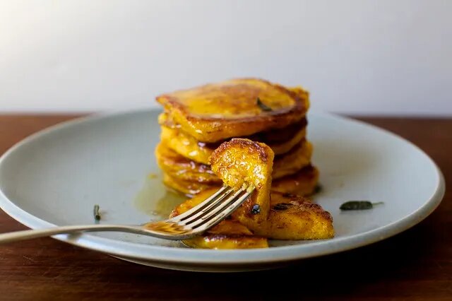 Ароматные и нежные тыквенные оладьи на завтрак или на десерт. Они получаются очень вкусными и станут любимым осенним или зимним десертом в семье. Попробуйте приготовить! Ингредиенты: Приготовление: 1. Разрежьте тыкву на 4 части и запекайте в духовке разогретой до 180 градусов 30-40 минут, до мягкости тыквы. Но проверяйте, время приготовления может меняться в зависимости от вашей духовки. По готовности превратите мякоть тыквы в пюре. 2. В глубокой тарелке смешайте до однородности тыкву, йогурт, яйца, сыр, 3/4 чайной ложки соли, перец и разрыхлитель. Добавьте муку и перемешайте до однородного состояния. Тесто должно получиться густым. 3. Нагрейте большую сковородку на среднем огне. Смажьте дно сковородки сливочным или оливковым маслом (можно использовать комбинацию масел) и выкладывайте тесто для блинов, используйте суповую ложку с горкой. Слегка прижмите тесто к сковородке чтобы разровнять его. Готовьте до золотисто-коричневого цвета снизу, переверните, и готовьте другую сторону