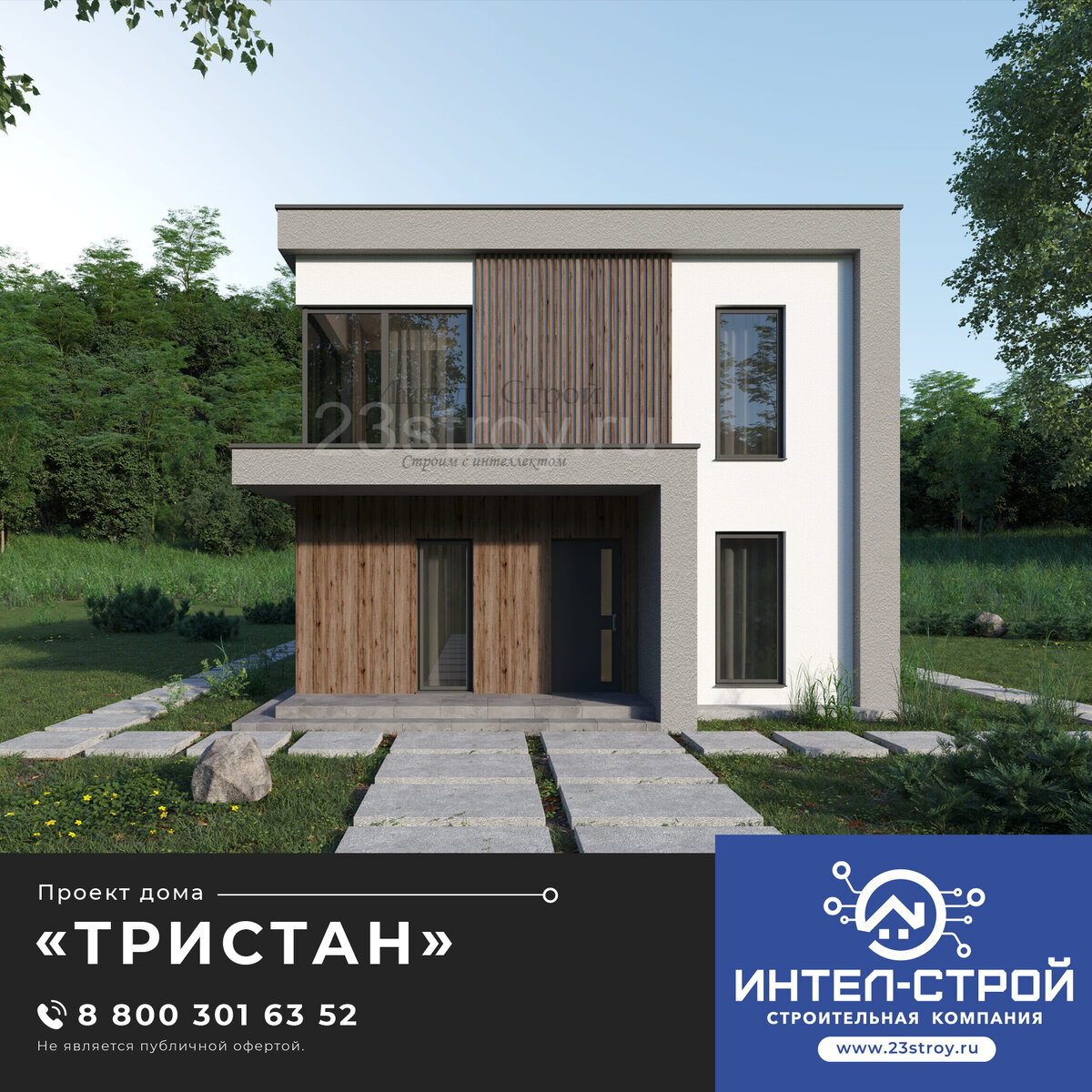 В отделке фасада мы использовали декоративную штукатурку двух видов и декоративные элементы с текстурой дерева. Коротко о проекте дома: