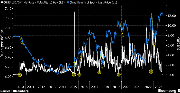 Банк Китая жестко контролирует курс юаня, не позволяя ему снизиться. Однако в прошлом периоды подобной стабильности часто предвещали значительные колебания курса китайской валюты. Биржевой курс USDCNY (голубым, левая шкала) и 10-дневная волатильность официального курса USDCNY (белым, правая шкала). Источник: Bloomberg В понедельник Банк Китая весьма незначительно скорректировал официальный курс юаня, проигнорировав его укрепление против доллара. Таким образом, регулятор продолжает сохранять официальный курс в очень узком диапазоне, вследствие чего его десятидневная волатильность опустилась до самого низкого уровня с 2010 года. Однако в прошлом периоды подобной стабильности юаня часто предвещали значительные колебания его курса. «Если Банк Китая смягчит контроль над курсом юаня, то медведи могут посчитать это возможностью для ставок на его снижение», — говорит главный экономист Guotai Junan International Жу Хао. — «Впрочем, это может произойти не раньше, чем USDCNY опустится ниже 7,15».