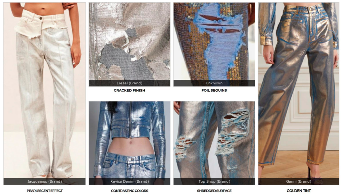 В ближайших сезонах будет много ретроспективных кадров 90-х, переделанных в соответствии с предпочтениями поколения Z. От брюк-бермуд до юбок макси — влияние культуры Y2K покорит следующий сезон с головой. Чтобы сделать его актуальным, производители джинсовой ткани используют различные способы стирки и отделки, не забывая при этом о важности фактора экологичности. Внедряются новые методы и техничность, чтобы идти в ногу с потребностями сознательных потребителей. Тренды для женщин Джинсы с металлическим напылением Металлик обещает стать одним из главных трендов ближайших сезонов. Фактура уже полюбилась многим звездам, причем не только на красных дорожках и вечеринках, где она уже давно популярна, но и в обычной жизни. Такие джинсы станут альтернативой привычным нарядным вещам для тех, кто не любит очевидные решения. Какие варианты предлагают зарубежные бренды Что можно купить у локальных марок Супер макси-юбки Мы привыкли к длинным юбкам из шелка, хлопка, атласа или костюмной шерсти, од