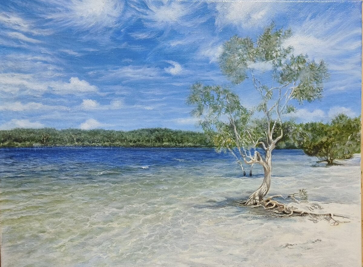 Перебирая свои старые фотографии, наткнулся я на фотографию пейзажа с острова Фрейзер. И решил попробовать написать по этой фотографии картину. Заинтересовало, получится ли у меня изобразить маслом прозрачность воды в озере и небо в облаках. Об острове Фрейзер в интернете можно найти достаточно много информации. Так что не буду здесь излагать те же факты. Место это хоть и мало известное, но у туристов очень популярное. Это самый большой остров на восточном побережье Австралии. Размеры острова около 123 км в длину и 22 км в ширину. До него можно с материка добраться паромом, в составе экскурсии на внедорожном автобусе или с личным автомобилем. Мы, во время нашего путешествия, взяли для экскурсии внедорожник, поскольку было интересно погонять на внедорожнике прямо по пляжам, что на острове официально разрешено, и это одно из главных развлечений. Так же по острову можно походить по туристическим тропам и посмотреть на красивейшие озера. Вот одно из таких озер и сохранилось на моей фот