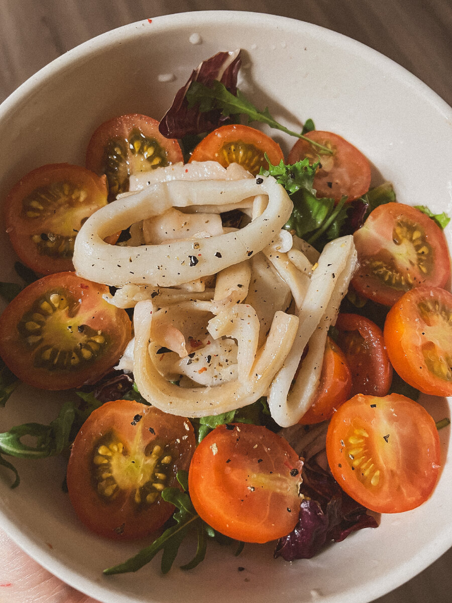 - Смешать в тарелке рукколу, разрезанные пополам черри и обжаренные кальмары. Перемешать. Полить заправкой.