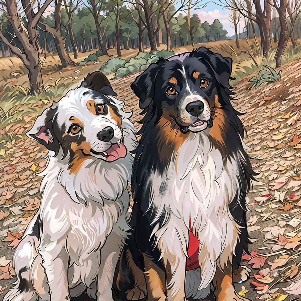 Начнем, пожалуй, со знакомства и с нашей аватарки, которую добрая нейросеть преобразовала в кадр из аниме (и даже не нарисовала им пятую лапу!) 💔 В этом посте расскажу о своих собаках, о себе, чуть позже. ЭЛВИС (ЭЛА) Он у нас старшенький (на фото справа). Австралийская овчарка, черный триколор, родился 29.10.2019г — уже в это воскресение ему исполнится 4 года!)) Время летит невероятно быстро! Элвис приехал к нам в Самару аж из Челябинска, я тогда только училась и не особо разбиралась в заводчиках, клубах и документах, нашла его фото на «Юле» и влюбилась с первого взгляда 🥹 Приехал он в итоге с метрикой без подписи заводчика, а также без клейма на теле, хотя в документах оно было указано. И бог бы с ними, но ко всему этому прилагался страх людей, странных объектов, пакетов, коробок, и прочего, и оочень оооочень много вокализации. В общем если коротко, у Элвиса довольно слабая и очень подвижная нервная система и вкупе с этим он холерик и возбуждение у него сильно преобладает над тор