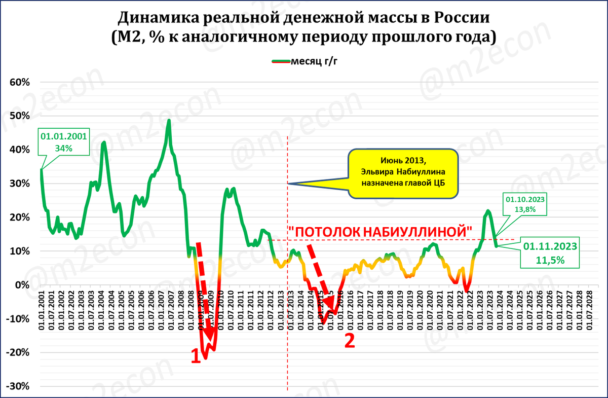 Завтра, 7 ноября, может выйти оценка ЦБ по денежной массе на 1 ноября. Мы же попробуем посчитать динамику реальной денежной массы, опираясь на динамику узкой денежной базы. Получается такая картинка. С 13,8% на 1 октября темпы роста реальной денежной массы, по этим предварительным расчётам, снижаются до 11,5%. Эльвира Набиуллина загоняет реальную денежную массу (РДМ), а вместе с ней и экономику России в привычные для "времён Набиуллиной" стагнационные рамки. Импульс, который получила экономика, ещё продолжит сказываться на динамике ВВП. Но очевидно, что этот импульс произошёл не благодаря, а вопреки действиям ЦБ (см. "Кого благодарить за устойчивость российской экономики" и "Экономика России растёт не благодаря, а вопреки действиям экономических властей"). === А как мы радовались, когда Набиуллина пробивала свой стагнационный потолок! P.S. Ориентироваться в моих статьях, заметках и видео удобно через НАВИГАТОР Более полный перечень статей с разбивкой по темам есть ЗДЕСЬ. ___ Рань