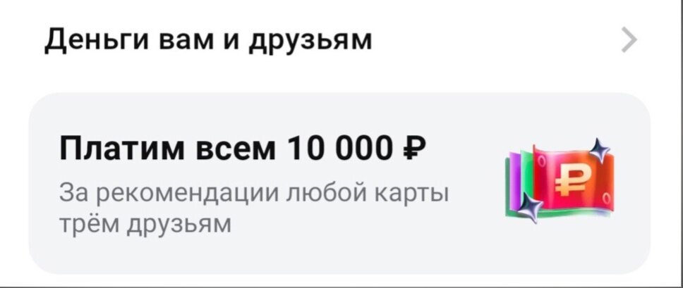 В данной статье будет показано как получить 10000 рублей за рекомендацию дебетовой карты. И так чтобы получить заветные деньги нужно выполнить пару шагов, вкладывать при этом ничего не нужно. При себе нужно всего лишь иметь дебетовую карту и пару хороших друзей. Если карты нету, нужно будет ее оформить для дальнейшего продвижения. Приступим к выполнению пунктов для получения денег: Также для более быстрых сделок с картами предлагайте карту родственникам, расскажите что это безопасно, никаких кредиток, все чисто. Родственники получат по 500 рублей, бесплатную карту с кешбеками, также поделитесь с ними от своей выгоды. После совершенных действий вам скажут спасибо за такое выгодное предложение. После получения карты и найденных родственников или друзей, заходим в приложение и находим раздел "Деньги вам и друзьям" Нажимаем на рекомендовать, получаем ссылку на дебетовую карту, которую мы отправляем удобным для вас способом. Для людей которые оформляют карту в первый раз может быть акция в