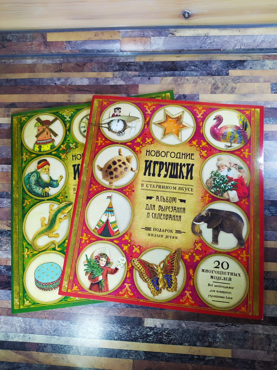 Я купила два альбома для склеивания и вырезания "Новогодние игрушки в старинном вкусе" с припиской "подарок милым детям". Ну что же, будем считать, что я впала в детство))) Один альбом пришёл с браком, но продавец в течение суток дал согласие на бесплатный обмен. И вот оба-два экземпляра у меня в руках. Мне эти альбомы подсунул Дзен, правда-правда. В моей статье высветилась реклама. Картинка привлекла моё внимание, а уж когда я почитала отзывы покупателей и посмотрела фотографии сделанных игрушек, то моментально сделала заказ. Пока я ничего ещё не склеивала, хочу показать вам целые альбомы. Волнуюсь - вдруг напортачу чего-нибудь?) Хотя издатель предполагает, что с этими игрушками справится и 5-летний ребёнок Я совершенно не разбираюсь в современном книгопечатании, поэтому меня для меня удивительно, что альбомы приехали из Китая. Каждый из двух альбомов содержит одинаковое количество игрушек - 20 штук Конечно, ребёнку для изготовления игрушки понадобится помощь взрослого. Подробных по