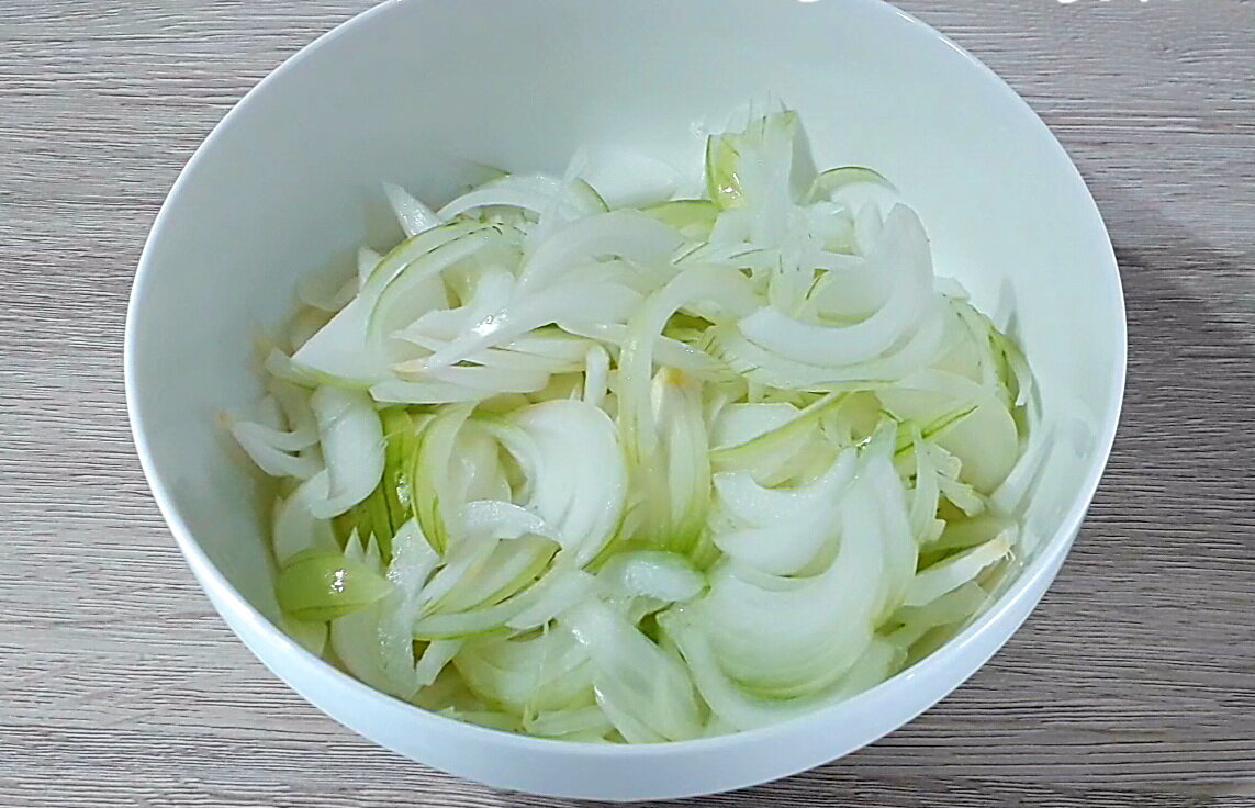 Вспоминаю, как в детстве выковыривал из еды лук. А в детском саду, на тарелке с борщом всегда по кругу оставался лук и воспитательница говорила, что я выловил все корабли из моря. Но в один прекрасный момент, я наоборот, так сильно полюбил лук, что ем его во всех блюдах, да и чтоб побольше было. Сегодня предлагаю вам интересный рецепт лукового пирога на сковороде. Прекрасная закуска, которую можно смело даже гостям предложить. Интересно? Тогда приглашаю к себе на кухню, где вы вместе со мной можете приготовить и попробовать такой пирог. ВИДЕО РЕЦЕПТ: ПОШАГОВЫЙ РЕЦЕПТ С ФОТО: Лук очищаю и нарезаю на 4 части. Складываю лук в сито, которое стоит в глубокой чаше. Заливаю кипятком лук и оставляю на 2 минуты. Это нужно, чтоб убрать немного горечь из лука. По истечении времени вынимаю из кипятка сито и отправляю лук в холодную воду. Это нужно, чтоб лук не размягчился. Как только лук остынет, вынимаю и ставлю сито на тарелку, чтоб стекла вода. Остывший лук нарезаю тонкими пластинами. Складываю