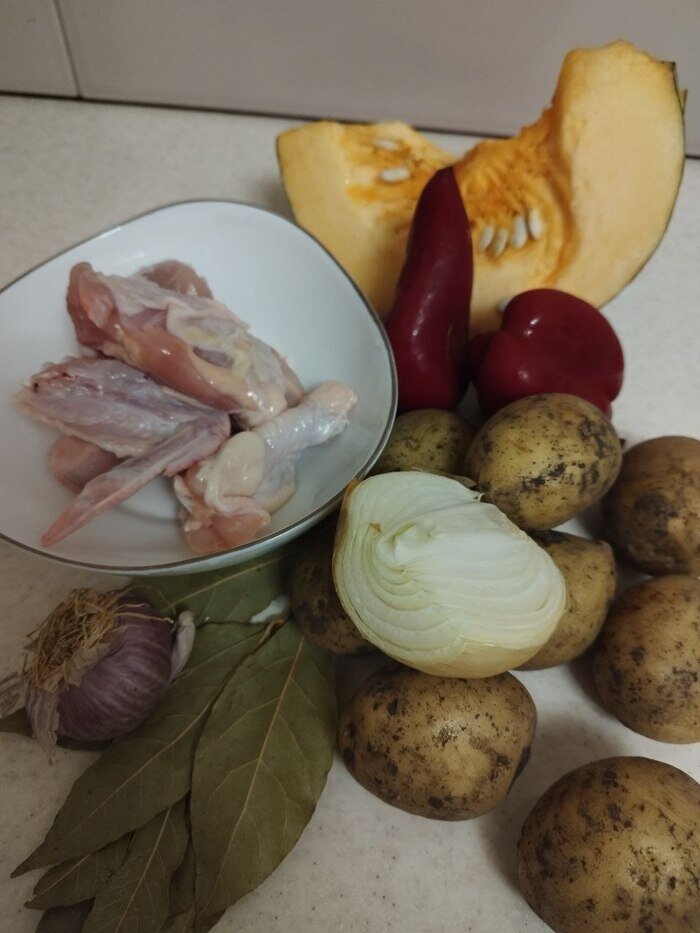 Итак, это последнее блюдо из все той же одной курицы. Куриные запчасти честно лежали и ждали своего часа, а точнее настроения готовить. ПРЕДЫДУЩИЕ РЕЦЕПТЫ: 1.Пряная курица с пшенной кашей. 2.Паста из кабачка. 3.Кукси на минималках. 4.Зеленый борщ. Вдохновение готовить ко мне так и не вернулось особо. Так что шедевров не будет. Будет то, что нашла в холодильнике. И все это с минимальными трудозатратами. А в холодильнике были: - Куриная нога и рука, попиленные на части. - 7 Небольших клубней молодой картошки. - Долька тыквы. - Два болгарских перца. Из стартер пака: чеснок, паприка, соевый соус, растительное масло, соль, сахар. На лук не смотрите, я его не использовала, он только на фотке есть. Поооехели! Картофель молодой, а значит чистить не надо. Хорошенько моем и пилим на производьные кусочки. С тыквы счищаем шкурку и пилим так же на небольшие квадратики. Перцы очищаем от семечек и режем так как понравится. 4. Куриные ножку и крылышко пилим по суставам, бедро еще на 2 части. 5. В мисо