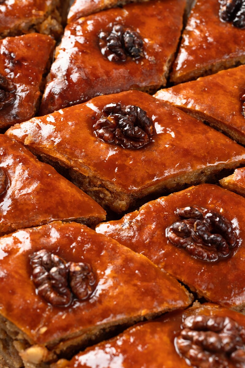 Для приготовления 12-14 небольших сладких ромбиков нужно: готовое слоёное бездрожжевое тесто – 800 г растопленное сливочное масло – 100 г желток – 1 шт. мука для раскатывания теста Для заливки: мёд – 250 г сахар – 100 г Для начинки: очищенные грецкие орехи – 2 стакана пудра сахарная – 1 ст. л. молотая корица – 1 ч. л. 1. Для начинки грецкие орехи измельчить и смешать с сахарной пудрой и корицей. 2. На присыпанном мукой столе очень тонко раскатать подготовленное тесто и нарезать пластами по размеру формы, в которой будет выпекаться пахлава. 3. В смазанную маслом жаропрочную форму выложить друг на друга 2 пласта теста, смазав каждый сливочным маслом. Тонким слоем нанести начинку, накрыть ещё одним пластом и снова смазать начинкой. 4. Продолжать укла