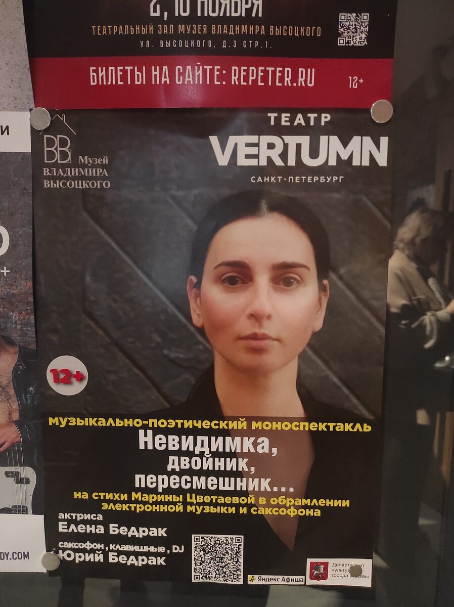 Литературно-музыкальный перформанс на стихи Марины Цветаевой Независимого театра Vertumn из Санкт-Петербурга можно было посмотреть в театральном зале музея В.Высоцкого На сцене двое: Елена Бедрак (художественное слово) и Юрий Бедрак (клавишные, программинг, Dj, саксофон) О театре Vertumn (который, кстати, активно гастролирует по всей стране, следите за афишами) я уже была наслышана. Так что шла на этот спектакль вполне осознанно. Признаться, начать знакомство с театром хотела именно со стихов М. Цветаевой. У меня особое отношение и к её творчеству, и к её судьбе. Особенно цепляет откровенность и предельная искренность стихов Марины Цветаевой. И конечно, в моей голове имелось некое представление о том, КАК надо читать стихи Цветаевой. Но Елена Бедрак взяла и прочитала их в 10 раз лучше!!! Тонко, проникновенно. Усиливая и смягчая там, где надо. Стихи в сопровождении электронной музыки и саксофона. Из декораций лишь нарезка из кадров Ман Рэя, Франсиса Пикабиа, Ганса Рихтера, Фернана Ле