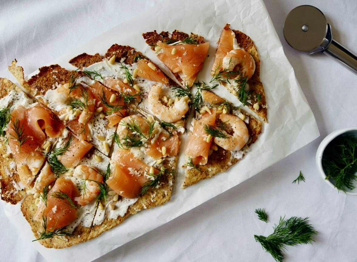 Рецепт полезной и вкусной пицца с лососем и креветками на основе из цветной капусты