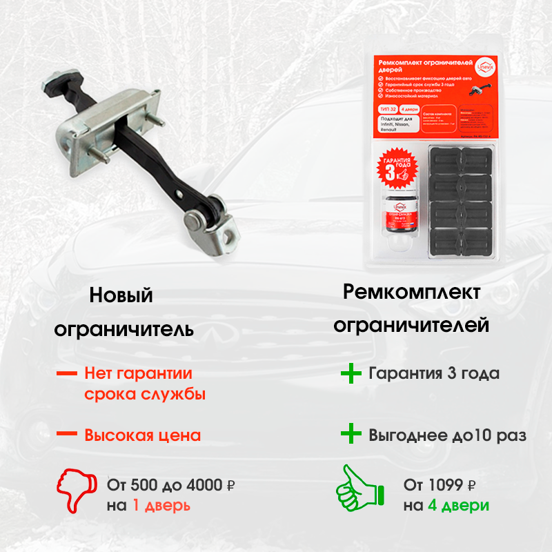 Устали от того, что двери авто болтаются? Постоянно приходится их придерживать, чтобы дверь не ударила ноги или наоборот, резко не распахнулась от порыва ветра. 😫 Давайте вместе сравним стоимость решения проблемы на примере ограничителей дверей для Infiniti FX35 (II). Рассмотрим 3 разных варианта ремонта: 🔹 Стоимость одного нового ограничителя на сайте Дром начинается от 3000 рублей. Так ремонт 4-х дверей обойдется около 12 000 рублей. 🔹 Контрактный ограничитель обойдется в среднем от 500 руб. За ремонт 4 дверей вы отдадите 2000-2500 руб. Но такие детали уже имеют износ. Сколько они прослужат и решат ли они вашу проблему – неизвестно. 🔹 Ремкомплект ограничителей дверей на автомобиль Infiniti FX35 (II) 4 двери обойдется в 1479 руб. Фиксация дверей как на новом авто, а на ремкомплект действует гарантия — 3 года. В состав ремкомплекта входит: — фиксаторы — 8 шт.