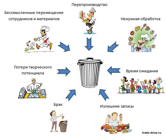 Согласно концепции «lean» на любом производстве возникает восемь видов потерь: