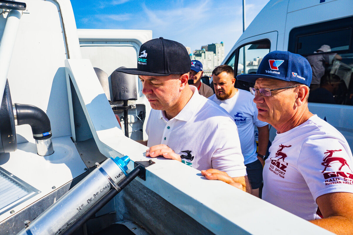 Утро первого дня гонки в лагере на стадионе Ак Барс Арены. Сверкающие автомобили без вмятин и царапин. Участники и механики в чистых комбинезонах, все полны сил и уверенности. Поддержать нашу команду Газ Рейд Спорт приехал управляющий директор Автозавода «ГАЗ» Андрей Софонов.
