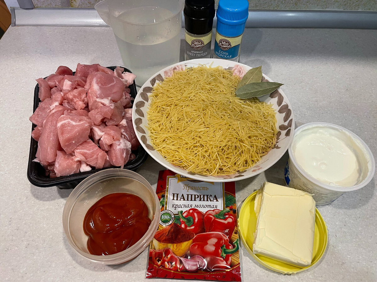 Рассыпчатая вермишель с вкусным мясом в соусе - что может быть лучше для семейного обеда или ужина. Приготовление совсем не сложное, все продукты доступные. Начнем приготовление. Для мяса в соусе мне понадобилось: Для гарнира я подготовила: 1. Из свинины я взяла гуляш. Он уже нарезан на кусочки. Если вы берете целый кусок, то помойте его и нарежьте маленькими кусочками или брусочками. 2. Разогрела сковороду с растительным маслом. Выложила нарезанное мясо и обжарила в течение 5 минут. 3. Репчатый лук почистила, помыла и нарезала маленькими кубиками. Выложила к мясу и обжарила еще 5 минут. 4. Добавила в сковороду томатную пасту, лавровые листья, соль, перец и паприку, перемешала. 5. Далее влила воду, перемешала, накрыла сковороду крышкой и тушила мясо 20 минут. 6. Пока можно заняться гарниром. Взяла глубокую сковороду, выложила сливочное масло и растопила его. 7. Всыпала вермишель. 8. Обжарила ее на среднем огне до золотистого цвета, постоянно помешивая. 9. Влила 450 мл воды, пе