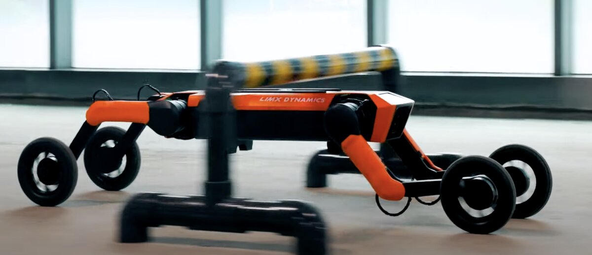 Китайская робототехническая компания LimX Dynamics представила робота W1 с колёсами на концах ног, который умеет изменять высоту корпуса относительно поверхности для проезда под низкими препятствиями. W1 может динамически совмещать ходьбу и езду на колёсах, преодолевать препятствия в виде уступов и даже двигаться по лестницам. Машина оснащена системой определения типа поверхности и способна автоматически переключаться между различными режимами передвижения на ходу, без остановки, а также динамически изменять высоту положения и угол наклона корпуса относительно земли. Робот имеет четыре ноги с выгнутыми в обратную сторону «коленными суставами». На конце каждой ноги установлено колесо с электромотором, которое при необходимости блокируется и может служить подошвой для ходьбы, причём с хорошим сцеплением.