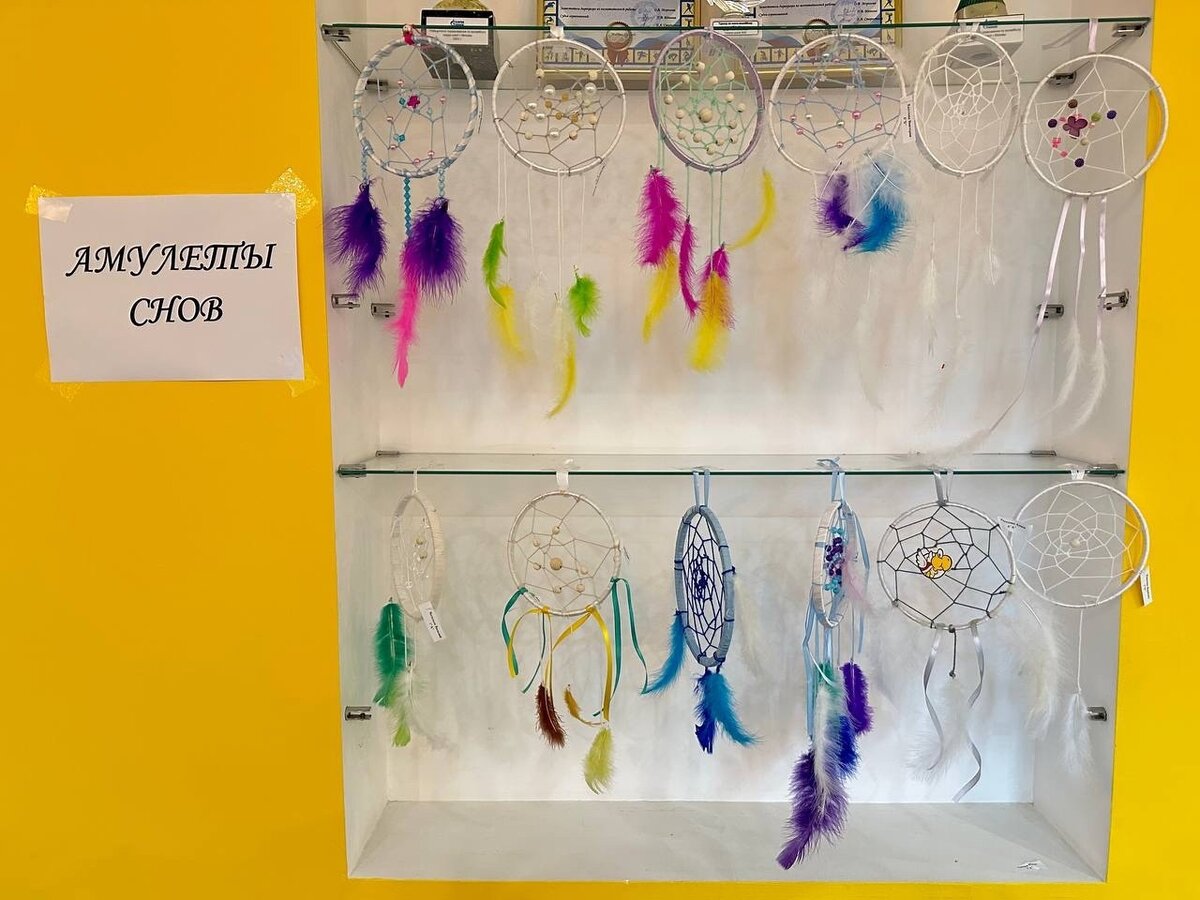 На первом этаже школы разместилась выставка, где представлены так называемые ловцы снов, защищающие от плохих сновидений. Работы выполнены на уроках технологии под руководством педагога Марии Юрьевны Афанасьевой: