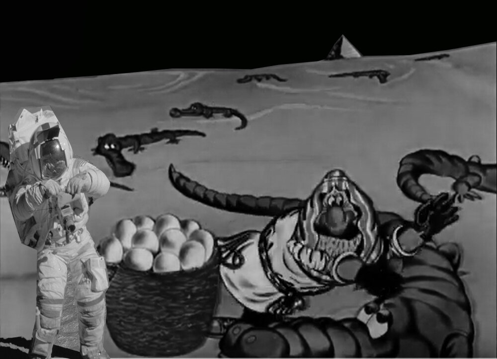Конечно видно, чувствуется, что это небольшой пятачок. Ведь пляж буквально истоптан ногами людей, и покрыт следами в масштабе 1:1, по размерам, которых мы без проблем можем вычислить реальный размер пляжа. Мозг наверное автоматически без нашего участия вычисляет размер площадки и выдает результат в виде готового ощущения. Но если убрать следы и то же самое пространство засыпать чем нибудь мелкодисперсным, цементом тем же, словом убрать видимые ориентиры, указывающие на реальный масштаб площадки, то ощущение по-настоящему большого пространства по идее должно возникнуть. Если на такой специально подготовленной площадке использовать макеты астронавтов, космической техники, отпечатки следов, камни и кратеры в соответствующем уменьшенном масштабе, искуственно создать распределение освещенности, домакетить дальнюю перспективу, наверное, можно создать ощущение огромного лунного поля. В подкрепление своих слов приведу несколько учебных комбинированных набросков, где лунная поляна отсыпана мелкодсперсным порошком на площадке размером метр на полтора, дальняя перспектива и горы изготовлены тем же способом и подклеены отдельно, фигурка туриста добавлена после всего. В общем то ничего такого, что было бы недоступно фотографам и кинематографистам в 50-х 60-х 70-х годах. Уже в 20е годы кинематографисты делали такие совмещения, склейки и монтажи, такие каше, домакетки, и плавающие маски на инфракрасном экране, найдите хотя бы в поиске отечественный экспериментальный фильм "Яблочко", известный в Голливуде как "русский терминатор", что безоговорочное западание на "лунные фотографии" НАСА в духе "а значит литали", без других, дополнительных доказательств, выглядит не совсем серьезно.