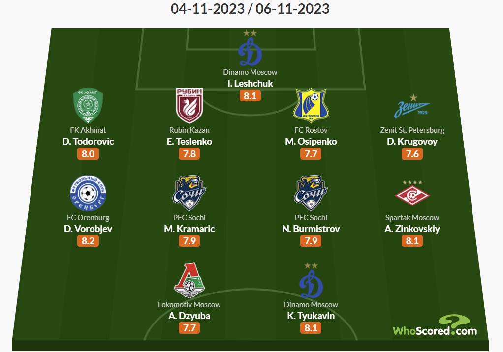 В команду недели вошли: Лещук, Тюкавин (оба - "Динамо"), Тодорович ("Ахмат"), Тесленко ("Рубин"), Осипенко ("Ростов"), Круговой ("Зенит"), Воробьев ("Оренбург"), Крамарич, Бурмистров (оба - "Сочи"), Зиньковский ("Спартак"), Дзюба ("Локомотив"). Больше новостей: https://bobsoccer.ru/