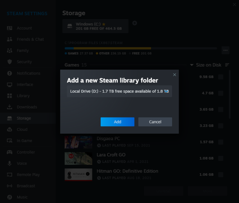 Вполне вероятно, что большая часть вашей цифровой коллекции находится в Steam, что, к счастью, позволяет легко перемещать ваши игры. Для этого перейдите в Steam > Настройки > Хранилище, чтобы открыть диспетчер хранилища. Нажмите значок + рядом с текущим диском и выберите дополнительное место установки. Нажмите «Добавить», и новая папка появится рядом с вашим первым диском.