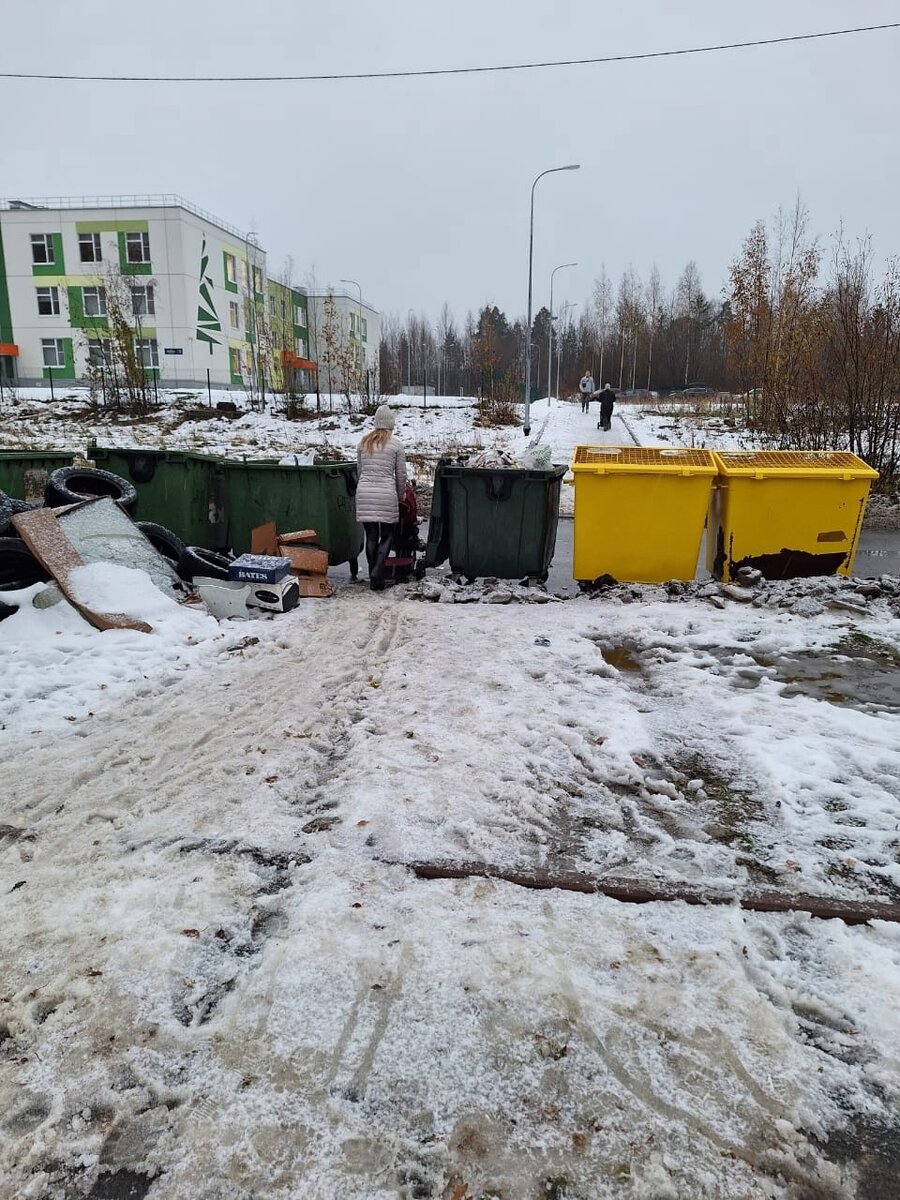 Родителям с детьми приходится протискиваться между грязными мусорными баками на местной контейнерной площадке, а потом ждать, пока проедут автомобили и пересекать проезжую часть на свой страх и риск. Пешеходного перехода там также нет.