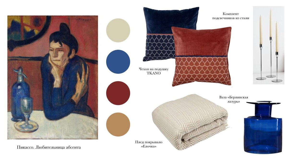 Что если для декорирования интерьера использовать известные картины художников? Не в смысле вешать их на стены, а в смысле трансформировать их в композиции, используя цвета подобранные мастерами на холсте? Составила три сета таких композиций, которые легко реализовать прямо сейчас. Получилось "оживить" картину? Какие картины возьмем для следущего эксперимента? Пишите в комментариях 1. Чехол на подушку TKANO 2. Плед покрывало «Елочка» 3. Ваза «Берлинская лазурь» 4. Комплект подсвечников из стали 1. Подушка декоративная с бахромой 2. Плед WARM WHIFF, хлопок 3. Настольная лампа 4. Комплект постельного белья Moon Store, сатин 1. Скатерть FURIXIN STONE Крапива 2. Салфетки сервировочные 3. Тарелка керамическая «Крем» 4. Ваза Soglasie, 27 см 5. Столовые приборы KUBAC