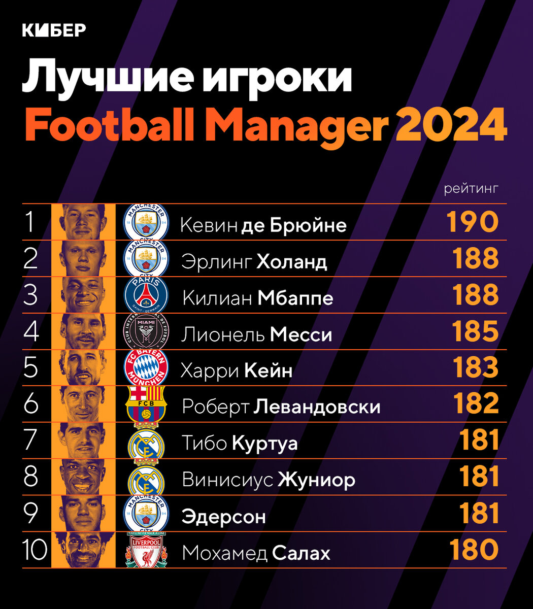 А где Месси и Роналду? Вышел Football Manager 2024. Sports Interactive освежила интерфейс и компьютерный интеллект менеджера, но главное изменение – составы нового футбольного сезона-2023/24. Рассказываем про игроков с самыми высокими текущими способностями в FM 24. Подпишись на наш телеграм про игры и кино: новости, инсайды и розыгрыши уже там! Лучшие игроки Football Manager 2024 Кевин де Брюйне – сильнейший игрок футбольного менеджера Sports Interactive. Бельгиец получил великолепные навыки пасов, дриблинга и дальних ударов. Места в топ-3 поделили бомбардир Эрлинг Холанд и самый быстрый футболист игры Килиан Мбаппе, а обладатель восьмого «Золотого мяча» Лионель Месси – четвертый по текущим способностям. В десятку менеджера попали форварды Харри Кейн и Роберт Левандовски, вингеры Винисиус Жуниор и Мохамед Салах, а еще сразу два вратаря – Тибо Куртуа и Эдерсон. Лучший хавбек оборонительного плана – Родри (12-й), а среди защитников разработчики выделили Вирджила ван Дейка (13-й). 38-лет