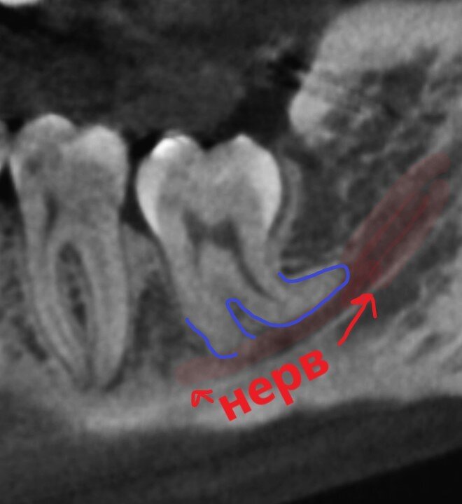 Такое удалять - переломать можно всё и зависнуть на много часов, потом осложнений не оберёшься. Вот и не берутся в клинике, отправляют в стационар. Докторов понять можно. Это - проблема. Кому оно надо - на ровном месте получить головную боль серьёзную? А вот и захватничество видно. Бедный нижнечелюстной нерв поджался и терпит. Как и хозяйка данного зуба. Но всему есть предел. Терпение закончилось и пришло время действовать. В Москве (а пациентка оттуда) было предложено удаление ретинированной 8-ки в ЧЛХ- операция с распиливанием и извлечением оного. И как пойдёт. А пойти могло всяко-разно. Это же 8-ка, чего вы хотите. И мы с этим тоже согласны - операция сложная, очень. Зуб этот конкретный - вообще огонь! Вы читали отзывы прошедших через выпиливание? На форумах творится всякое, а итог - упаднические настроения и страх на всю жизнь. Если не читали, то и не советую. Отговариваю, прямо таки. Особенно тех, кому операцию предстоит перенести. У всех свой опыт. Посмотрели на сей шедевр м