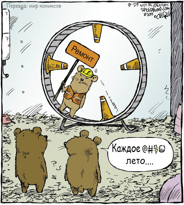 Быстрые, как мысль и такие же глубокие, интересные и смешные – все это «Лежачий полицейский». Кстати, название «знаковое». Автомобилисты не дадут соврать, что такая преграда на дороге заставляет притормозить и «ощущается всем телом». За комиксы Dave Coverly взгляд цепляется не хуже, чем колеса авто за помеху.