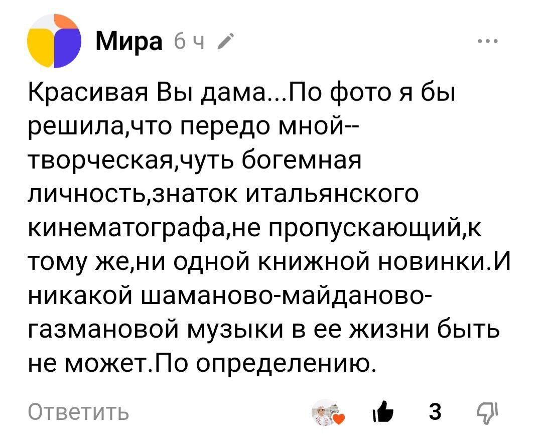 08.11.2023 Сегодня без предисловий и сантиментов, с места в карьер, как говорится. Пардоньте, что образ на фото на совпал с вашей реальностью 😜 С каких пор стало неприличным слушать Газманова, Майданова и Шамана? Или признаваться в этом? Да, я люблю слушать песни российских авторов и исполнителей. И не только Шамана, Майданова и Газманова. Мой плейлист весьма обширен 🎶 А знаете почему? Потому что они поют их на русском языке. В них, в песнях этих, я не только мелодию слышу, но смысл понимаю. Не отрицаю тот факт, что все любители зарубежной эстрады полиглоты и понимают о чём поют иностранные исполнители. А я вот, кроме русского и немецкого со словарём, других языков не знаю. И, когда слушаю иностранные песни, могу заценить только мелодию. Ну, ладно, вру! Ещё без словаря пойму "Ciao Bambino, Sorry" и "ай лав ю". Мне вообще непонятно преклонение перед всем иностранным. Как будто если это английский, французский, американский или итальянский фильм, или музыка, или книга, то они апри