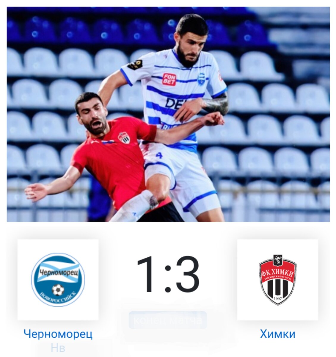 Черноморец потерпел поражения от Химок 05 ноября 2023 года в городе-герои Новороссийск на стадионе Центральном футбольный клуб Черноморец встретился с футбольным клубом Химки. На 31 минуте полузащитник футбольного клуба Химки Равиль Нетфуллин забил гол вратарю футбольного клуба Черноморец Даниилу Фролкину. На 35 минуте полузащитник футбольного клуба Черноморец Шамиль Саадуев забил гол вратарю футбольного клуба Химки И гол рю Обухову. На 72 минуте полузащитник футбольного клуба Химки Аршак Корян забил гол вратарю футбольного клуба Черноморец Даниилу Фролкину. На 90 минуте полузащитник футбольного клуба Химки Тимур Касимов забил гол вратарю футбольного клуба Черноморец Даниилу Фролкину. Игра закончилась со счётом 1:3. МЕЛБЕТ Первая лига Сезон 2023-2024 17 тур 05 ноября 2023 года Черноморец - Химки 1 - 3 Фото vk.com/chevec yuvecpyc.tilda.ws hipolink.me/chevec vk.com/chevec ok.ru/chevec dzen.ru/chevec