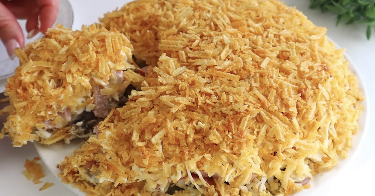Оказывается, при помощи одной лишь горсти чипсов можно сильно преобразить обычный многослойный салат. Этот дополнительный ингредиент добавит несколько баллов презентации такого блюда и еще улучшит его вкус. Благодаря приятному хрусту чипсов салат «Птичка» станет вашим новым любимцем. Помимо того, что это блюдо выходит очень аппетитным, оно еще может похвастаться особой питательностью. Ведь в него входят яйца, грибы, сыр и два вида мяса: отварная куриная грудка и копченая колбаса. Как приготовить многослойный салат «Птичка» Мы добавляли в эту закуску чипсы со вкусом сметаны и зелени. Вы же можете выбрать любые другие. К примеру, чипсы со вкусом сыра, куриных крылышек или паприки станут отличным и декором, и дополнительным ингредиентом для такого салата. Ингредиенты Приготовление ; ; ; ; ; ; ; ; ; ; Воспользуйтесь маленькой хитростью во время приготовления этого яркого салата. После варки куриной грудки оставьте ее остывать прямо в бульоне. Благодаря этому мясо будет в разы сочнее, и сал