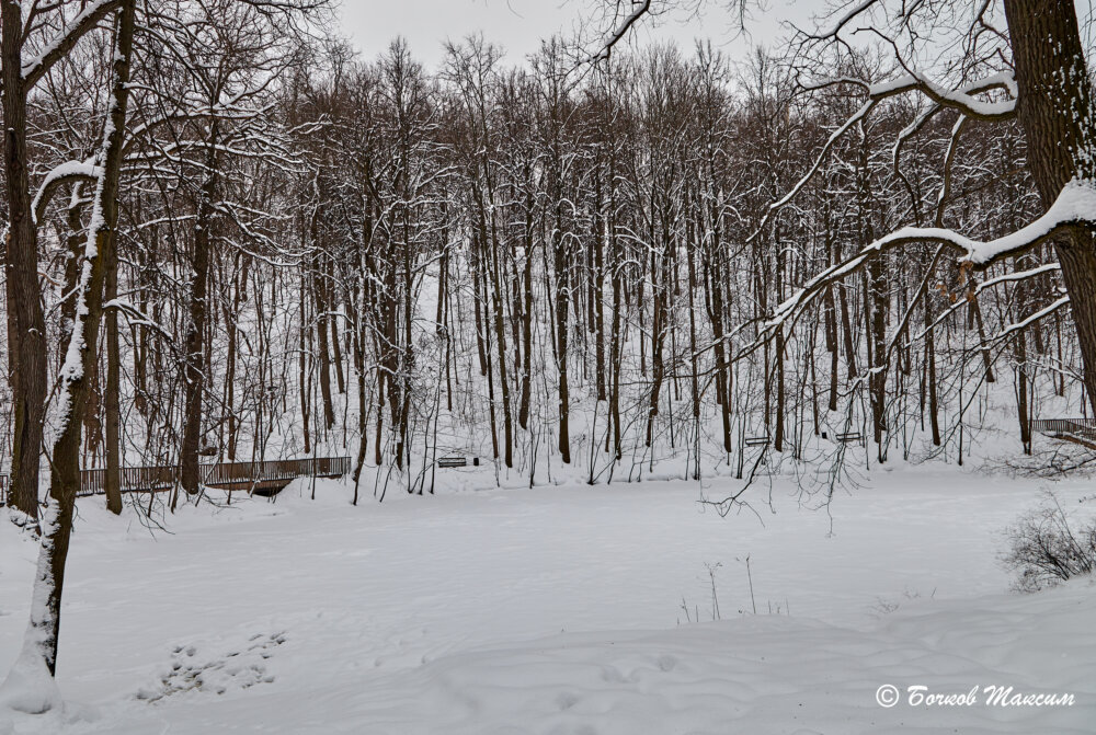 Пройдя по дороге, свернули на расчищенную грунтовую дорогу покрытую пушистым снежком.