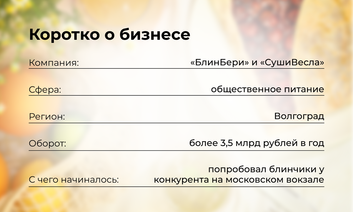 Впоследствии он вспомнит об этих счастливых моментах из детства, и при открытии уже своей блинной возьмёт за правило: вызывать у гостей заведения чувство дома, тепла и счастья через вкус блинов.