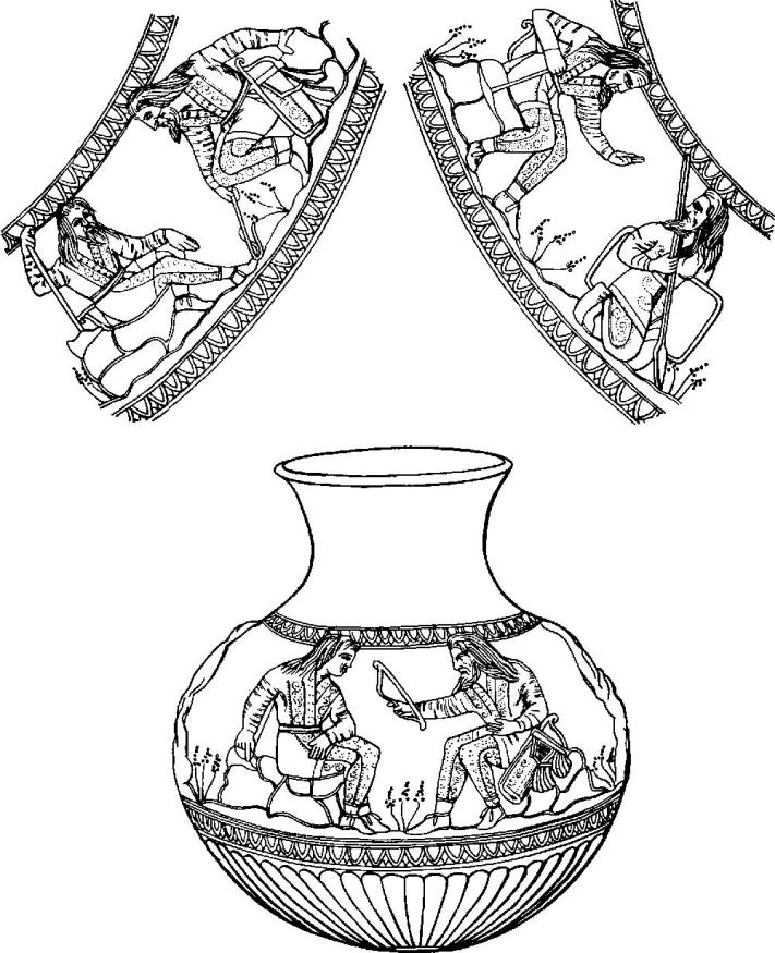 Показательно, что «меланхлены» - это греческое прозвище. Геродот, подробно описывающий этнографические особенности и легенды о происхождении скифов, невров, агафирсов, будинов и т.д. о меланхленах сообщает только, что они «носят черные одежды, отчего и происходит их название. Нравы у них скифские». То есть, то, что можно выявить из самого их прозвища. В общем, подозрительные они какие-то. На основании перечня врагов скифов меланхленов помещали на днепровском левобережье, смещая будинов куда-то в сторону Волги. Рыбаков вернул Левобережье «скифам-земледельцам», будинам и гелонам, а меланхленов отождествлял со среднедонской культурой кочевников, близких к скифам. К такому выводу Борис Александрович пришел, потому что отождествил «царских скифов» с «особыми скифами», упомянутыми Геродотом в другом месте. Эти «особые скифы» отделились от «царских». С этими «особыми» скифами Рыбаков связывал в свою очередь группу воронежских курганов, оставленных носителями скифской культуры. Однако, тут есть одно противоречие: Геродот пишет, что они ушли, чтобы избавиться от ига «царских», то есть принадлежали к какой-то другой группе скифов, скорее всего «исконным». Последнее предположение подтверждается находкой, с помощью которой Рыбаков как раз пытался доказать, что воронежские курганы оставлены "царскими скифами". Речь идет об изображении на серебряном сосуде, которое явно является иллюстрацией легенды о Скифе, Гелоне, Агафирсе и луке Геракла: