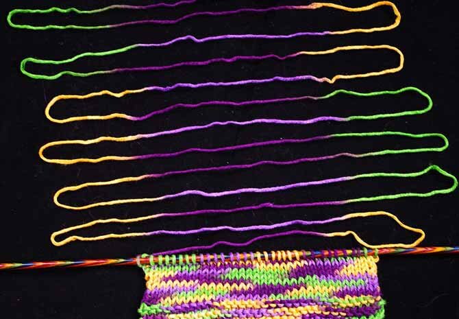 Хотите управлять узорами из секционной пряжи? Тогда нужно освоить технику пулинг. Вязать можно и спицами, и крючком, важно только чтобы пряжа была именно секционного окрашивания. Длина отрезков и порядок чередования цветовых участков в одной секции должны быть одинаковыми на всем протяжении нити. Меланжевая пряжа не подойдет, у нее более короткие цветовые отрезки. Узор в этой технике получается при тщательном измерении ширины изделия или количества петель в ряду. И второе, плотность вязания должна быть одинаковая, и в лицевых рядах, и в изнаночных, и в рядах между собой. Многие вяжут пулинг платочной вязкой – получается ровнее. Если вязать просто, то получается переход из цвета в цвет. Но применив некоторые расчеты, можно вывязать необычный узор. Как же рассчитать? Рисунок получается в процессе вязания за счет смещения петель каждого цветного участка вправо или влево. Для этого узнайте, какое число петель в одном цветовом раппорте. Узор выполняется довольно просто, но время и усилия на