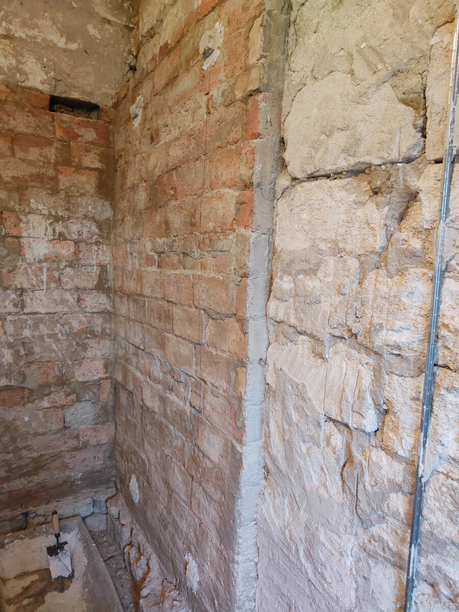 Наша печная стена в одной из комнат немного выступает от общей плоскости стены, мы её оштукатурили, но остались нетронутыми тонкие грани и соответственно углы сбоку и сверху. Вот как этот участок выглядел изначально. Установили маяки. Затем оштукатурили. И на торцах выступающей части получили вот такое безобразие. На самом деле такие области штукатурить совсем не сложно и не составляет больших хлопот. Продаются специальные штукатурные металлические уголки, но я как то пробовал, мне не понравилось с ними работать, мы делаем по другому. Единственное условие для этого способа, обе поверхности (в нашем случае поверхность печки и стены за ней) должно быть ровными. Небольшое неудобство состоит в том, что мы не сможем эту работу сделать за один день, в нашем примере потребуется как минимум три дня, но, как это часто бывает, мелочи доставляют хлопоты и требуют кропотливости. В нашем случае, такая работа хотя и растянется на несколько дней, но при этом в общей сложности не займёт много вр